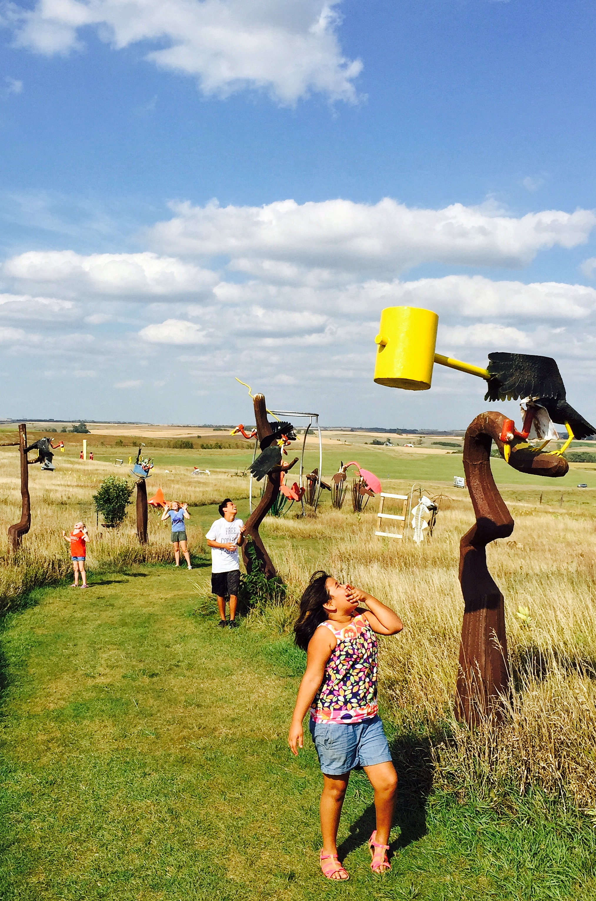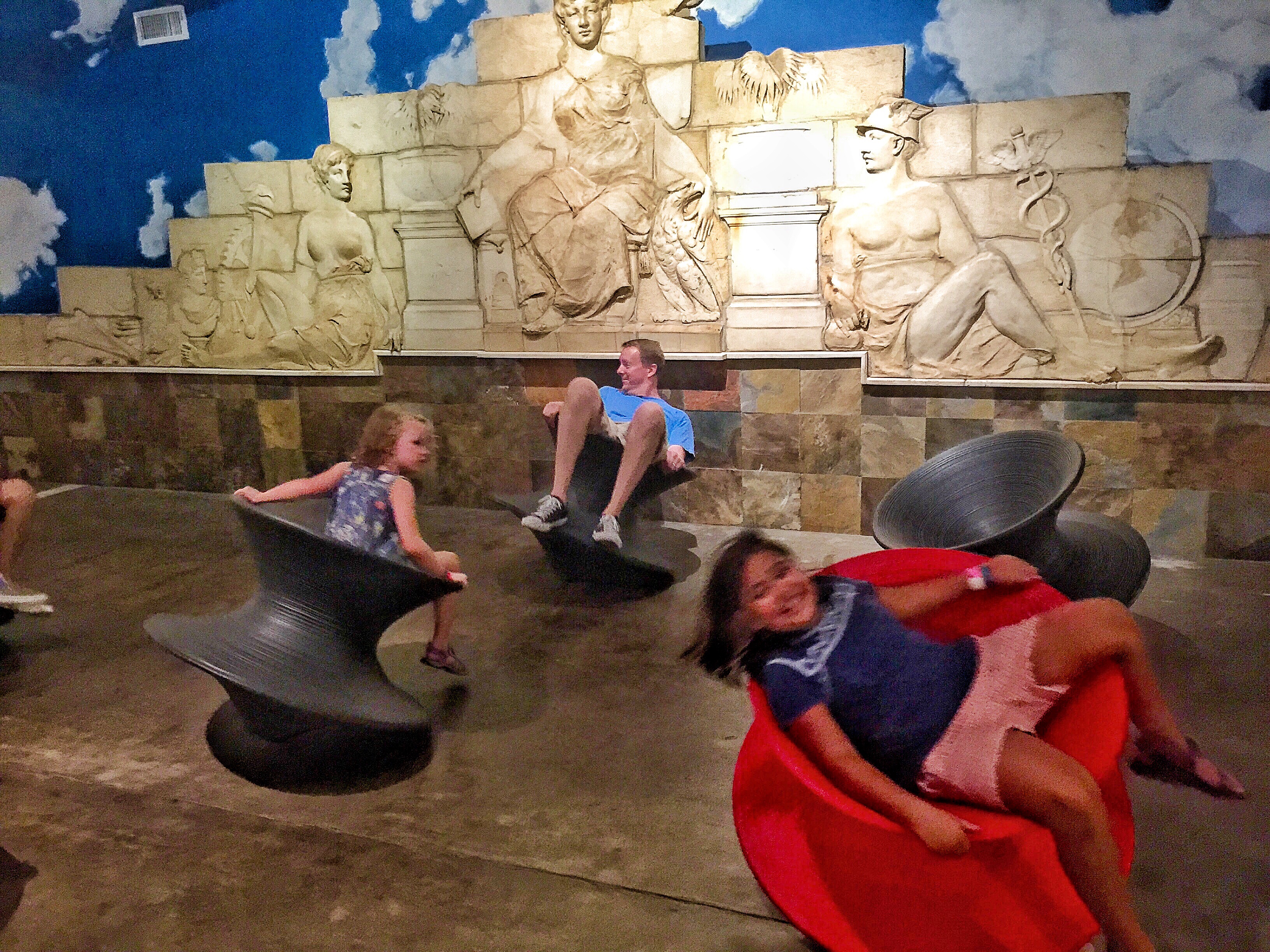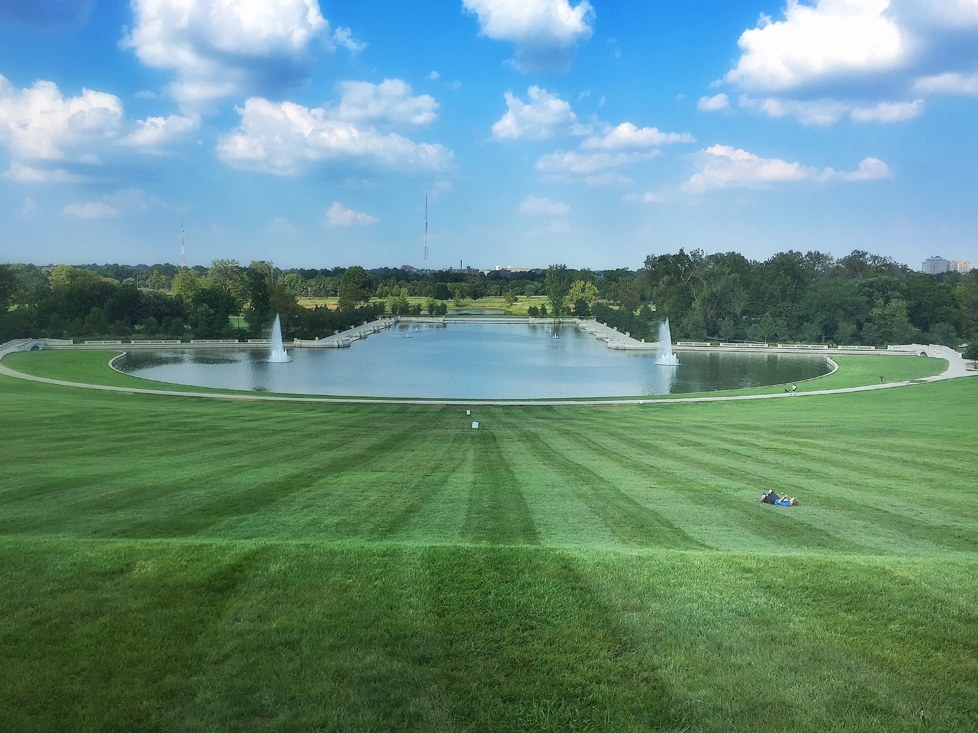 Brandon needed to work, so he dropped us off in Forest Park, site of the 1904 World’s Fair. We’d watched Meet Me in St. Louis on the road, so we (the girls) sang all of our favorite songs as we drove in circles looking for the Zoo entrance. It’s free! And we could practically pet the penguins. Over the hill, we found the art museum, also free! Out front were gorgeous rolling lawns (we rolled), a reflecting pool, fountains, and Louis IX, St. Louis’s namesake.