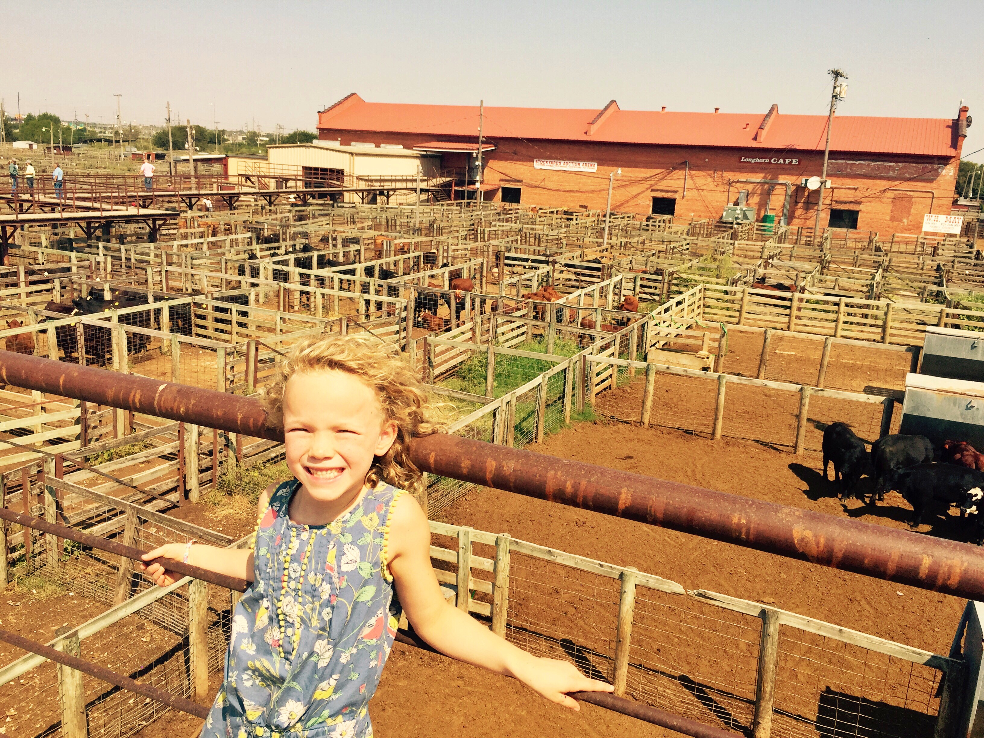 The next morning, we drove to Oklahoma City and watched a bit of the auction at the Oklahoma National Stockyards. A mini-stadium full of half-reclining cattlemen communicated in winks and nods with a yodeling auctioneer and a seller’s agent while we tried in vain to decipher what characteristics made one cow a better buy than another. We discussed the terms yearling, heifer, bull, steer, castration, wean, feeder, and slaughter to the horror of our teenaged boys.
