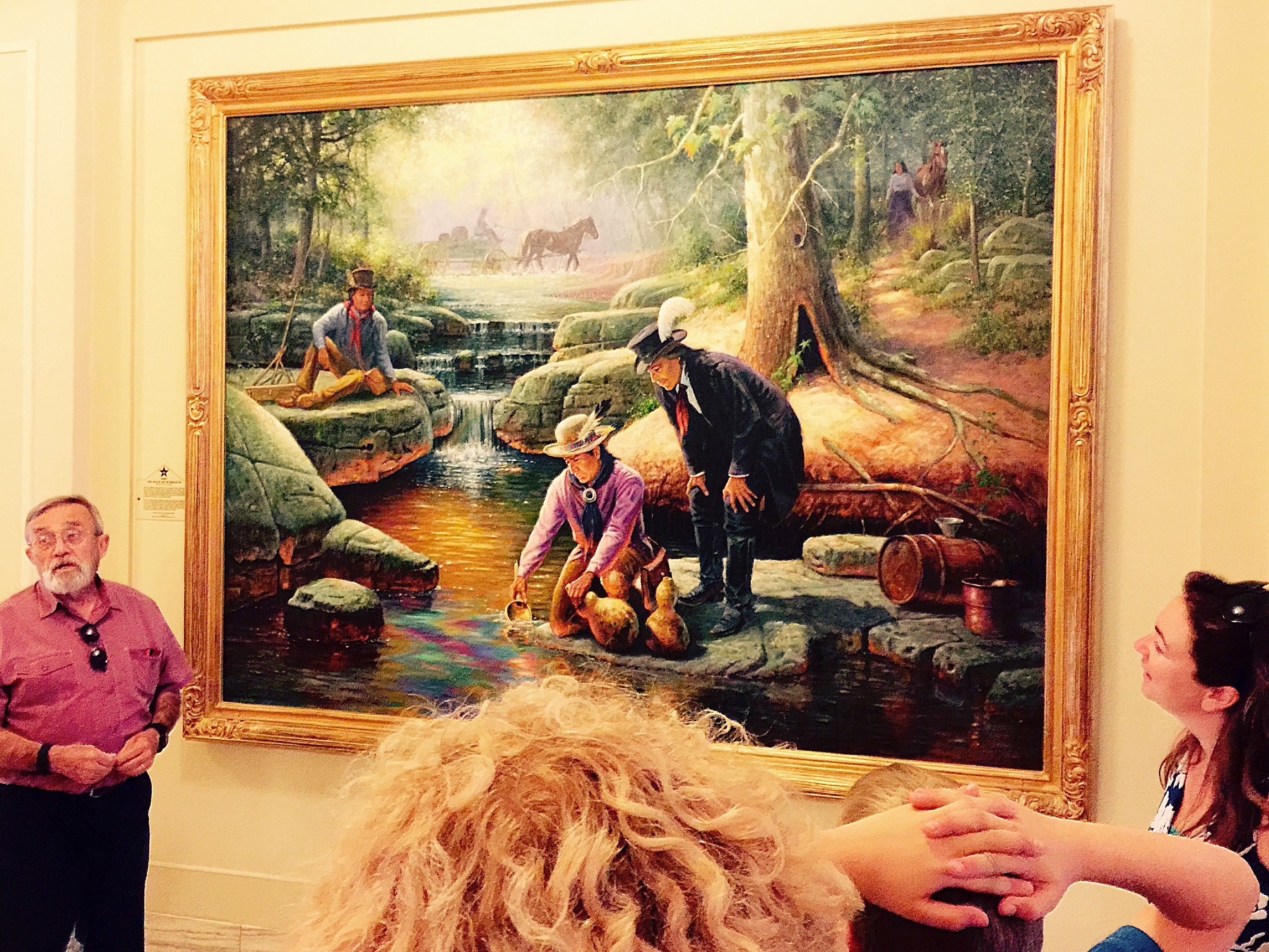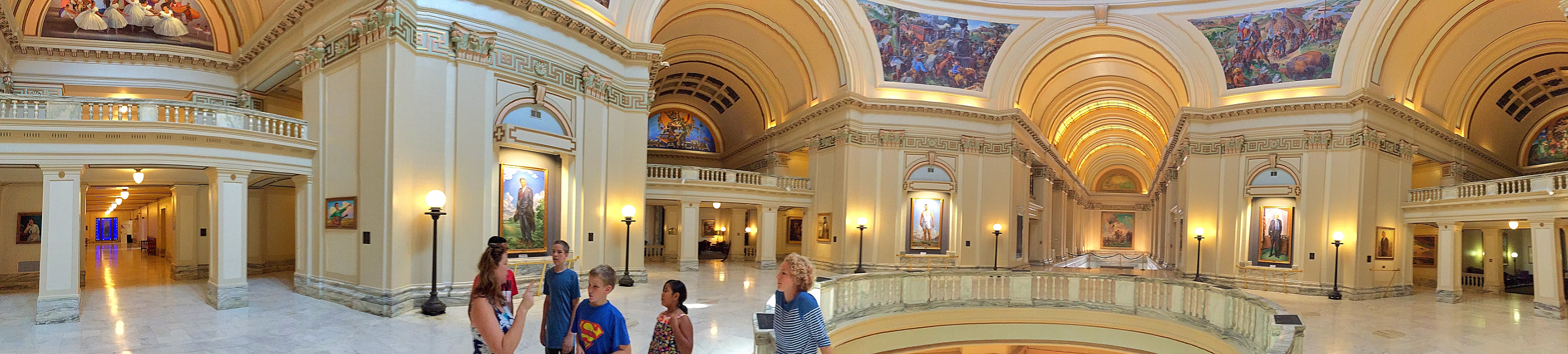 Downtown, we visited the Capitol. It’s a gorgeous building, despite having an oil derrick in the front yard. There are vigilant gryphons on the outside and a statue by a self-taught Native American senator named Enoch Kelly Haney on top of the dome. The inside is all marble and painted plaster rosettes and stained glass. We got a crash course in Oklahoma history as we toured the art-filled building. Each kid picked a notable Oklahoman for further research, and they’ll present their findings after we set up camp tonight. How much do you know about Jim Thorpe, Will Rogers, John Hope Franklin, Sequoyah, Ada Lois Sipuel Fisher, and Maria Tallchief? Shout out, and we’ll post a biography of your choice.